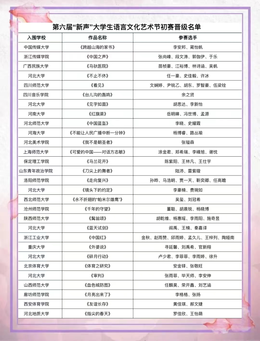 近日,河北省语言文字工作委员会、河北省教育厅公布了第六届“新声”大学生语言文化艺术节初赛晋级名单,我院参赛作品《走向复兴》顺利入围复赛。
