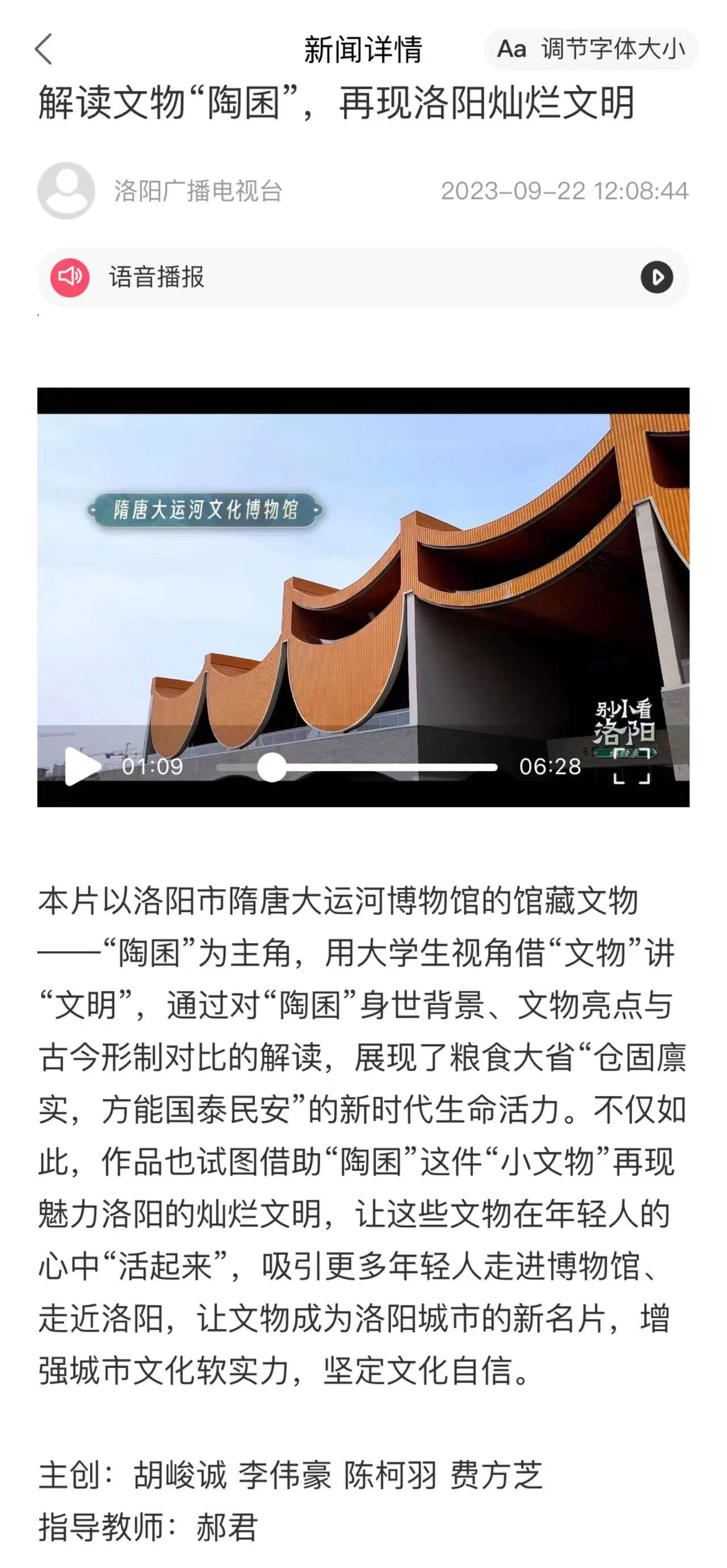 9月22日,洛阳广播电视台融媒体移动平台“看洛”客户端连续推送了由我院广播电视编导专业师生共同创作的系列短视频《别小看洛阳(博物季)》,该作品上线第一天,阅读量就已破万。