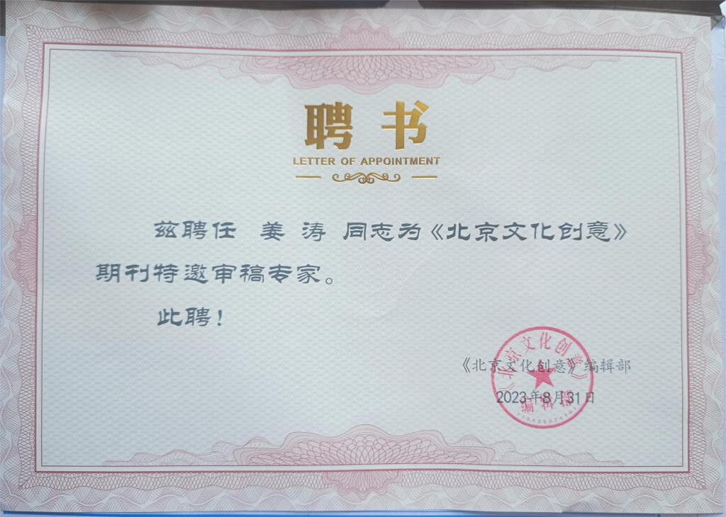 2023年8月31日,我院教师姜涛博士被《北京文化创意》期刊聘请为特邀审稿专家。《北京文化创意》是中共北京市委前线杂志社主管主办、北京联合出版有限责任公司主办出版的学术类期刊。编委会实力雄厚,阵容强大,汇集了一大批学界精英,主任由原国家新闻出版总署署长、第十二届全国人大教育科学文化卫生委员会主任委员、清华大学文化创意发展研究院院长柳斌杰担任。该刊物注重理论和实践相结合,倡导具有国际视野、根植中国实践的学术研究,致力于打造具有广泛影响力的文化创意学术研究期刊品牌,所刊文章多次被人大复印资料全文转载。主要发表有关游戏动漫、创意设计、媒体融合、影视综艺、出版发行、演艺娱乐、文旅产业、文博非遗、文创智库、工艺设计、文创经济、艺术品鉴赏与交易等与文化创意相关的学术论文稿件。