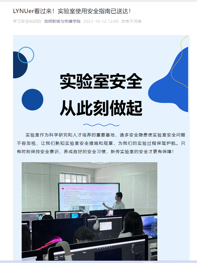 根据河南省教育厅和省高校实验室工作研究会统一部署,我校开展了第三届“实验室安全文化宣传月”活动。活动期间,新闻与传播学院积极响应,结合自身专业特色,丰富形式,创新内容,多措并举,筑牢实验安全防线。