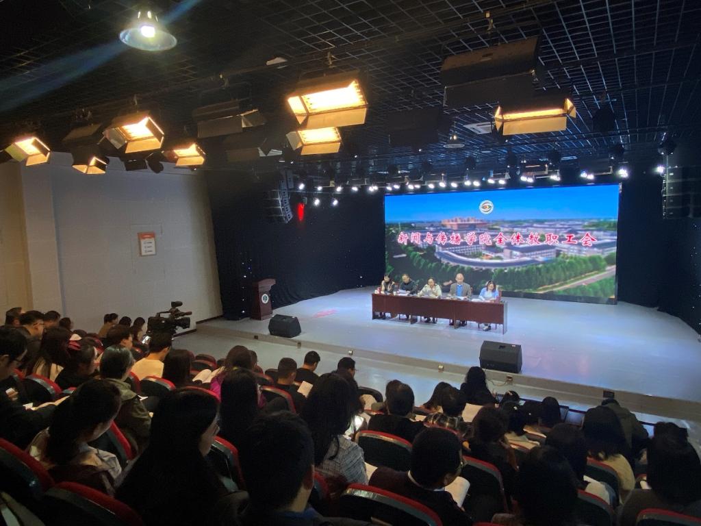 2023年10月19日,学院在一楼演播厅召开了新学期全体教职工会,安排部署新学期工作。学院领导班子成员和全体教职工参加会议。