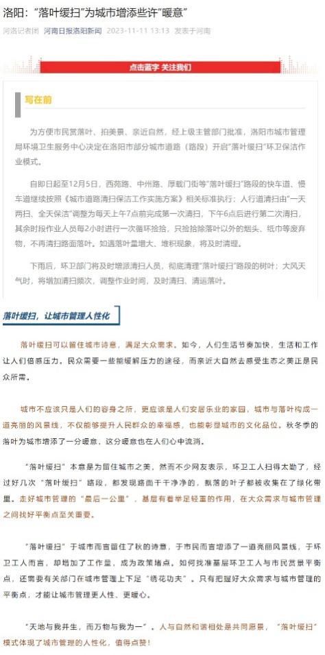 为方便市民赏落叶、拍美景、亲近自然,经上级主管部门批准,洛阳市城市管理局环境卫生服务中心决定,在洛阳市部分城市道路(路段)开启“落叶缓扫”环卫保洁作业模式。文章为这一方案点赞,认为“落叶缓扫”“可以留住城市诗意,满足大众需求”,体现了城市管理的人性化思维。