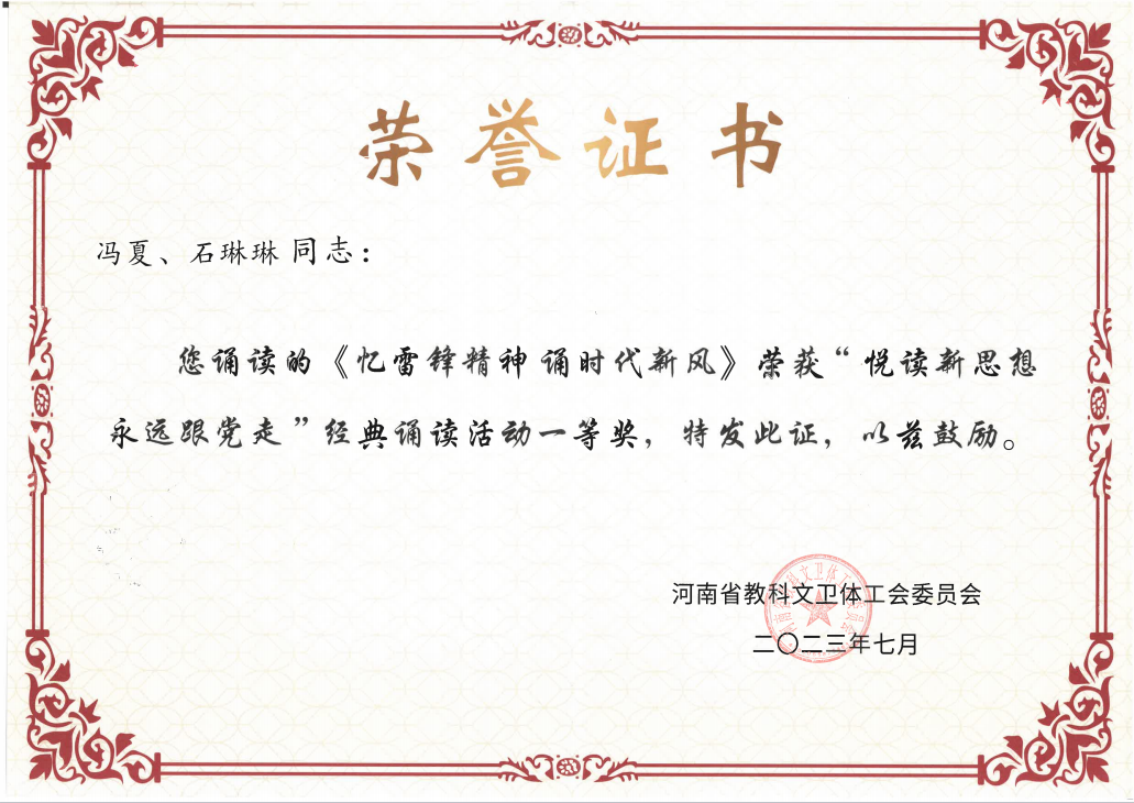 近日,由中共河南省委宣传部、河南省总工会联合开展的学习党的二十大精神“悦读新思想 永远跟党走”河南省职工经典诵读活动获奖名单公布,我院播音与主持艺术专业教室冯夏、石琳琳的诵读作品《忆雷锋精神 诵时代新风》获省教科文卫体系统一等奖。