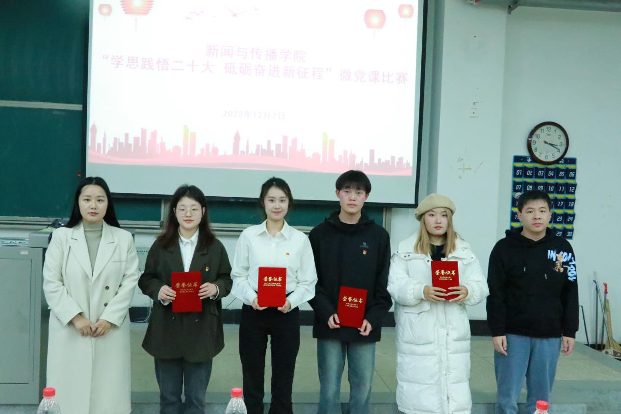 为深入学习宣传贯彻党的二十大精神,激励广大师生党员用习近平新时代中国特色社会主义思想武装头脑、指导实践、推动工作,院党委于2023年12月7日在115教室举行“学思践悟二十大 砥砺奋进新征程”主题微党课比赛。学院党委书记钱越,党委副书记金宜洛,党委委员、副院长于正凯、李姗姗,教工党支部书记蒋琳、冯运生,组织员李玉刚担任本次比赛评委。学生党支部书记、全体学生党员和入党积极分子参加活动。