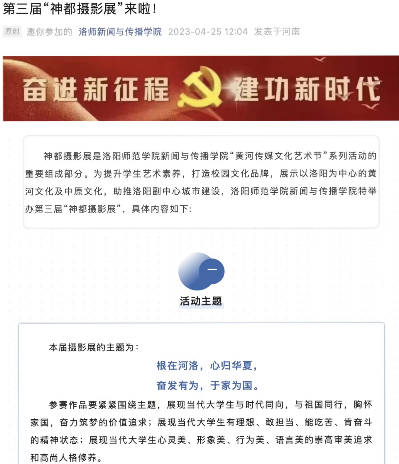 第三届神都摄影展以“根在河洛,心归华夏,奋发有为,于家为国”为主题,由广播电视编导系承办,校融媒体中心、一瞬间摄影协会协办。4月24日开启作品征集,6月份开展评选活动。本次影展共收到作品近百幅,参赛作品择优推选至“第七届河南省大学生艺术展演”并入选省大艺节优秀艺术作品现场展演活动。