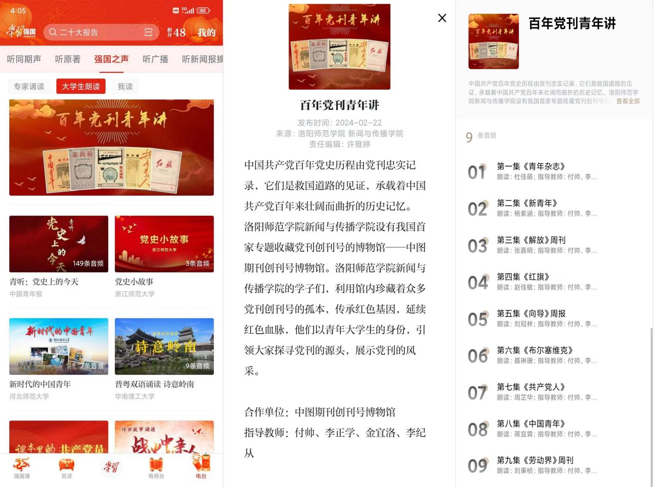 新学期伊始,由我院新媒体中心主任付帅等老师指导学生创作的系列网络音频作品《百年党刊青年讲》在中宣部“学习强国”学习平台“强国之声”栏目“大学生朗读”频道上线推出。
