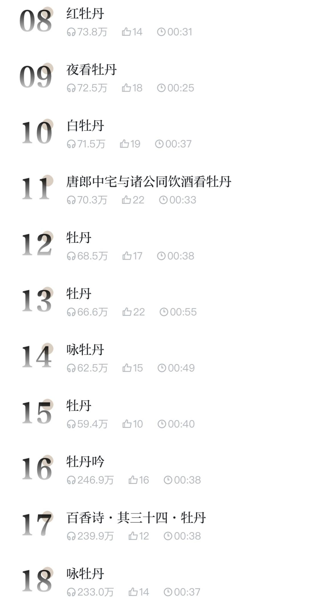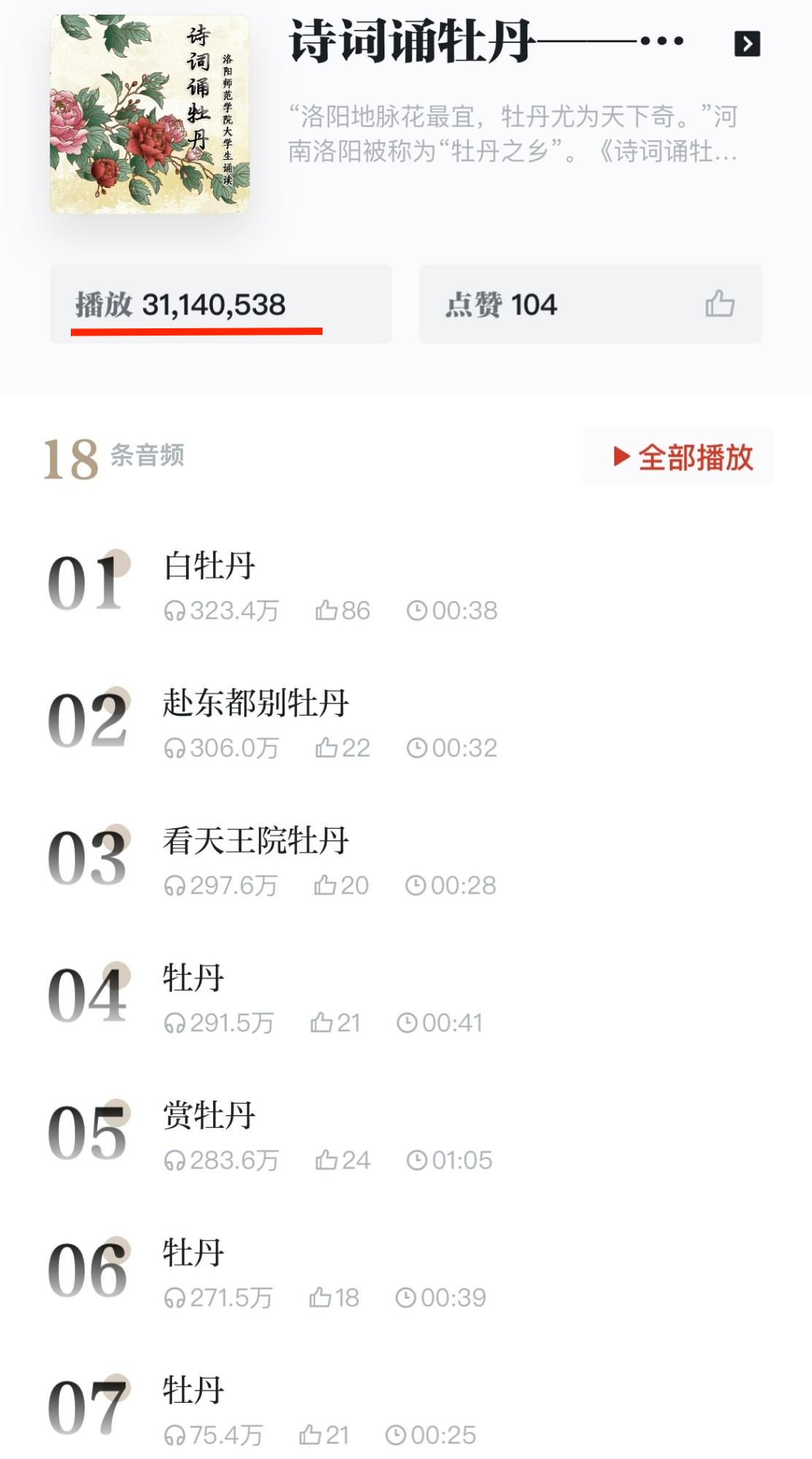 《诗词诵牡丹》系列作品以“牡丹之乡”洛阳为背景,围绕历代文人有关牡丹的诗词佳作展开,包括《赏牡丹》《咏牡丹》《赴东都别牡丹》《夜看牡丹》等18条音频,我院师生发挥学科优势与专业特色讲述牡丹故事,帮助听众更深刻地了解有关牡丹的历史文化内涵,部分单条音频作品达300万+播放量。