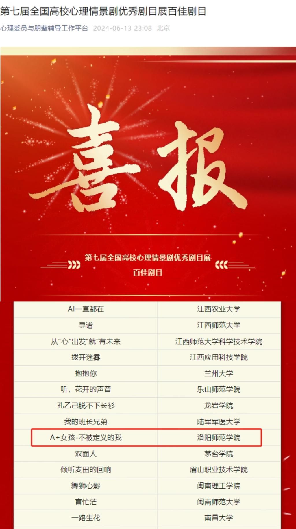 近日,由中国心理学会心理危机干预工作委员会与国家心理健康和精神卫生防治中心共同主办的第七届全国高校心理情景剧优秀剧目展圆满落下帷幕,我院精心编排的心理剧《A+女孩—不被定义的我》在290余所高校推荐的优秀作品中脱颖而出,荣获全国百佳剧目奖,河南省内高校仅有5所高校获此殊荣。
