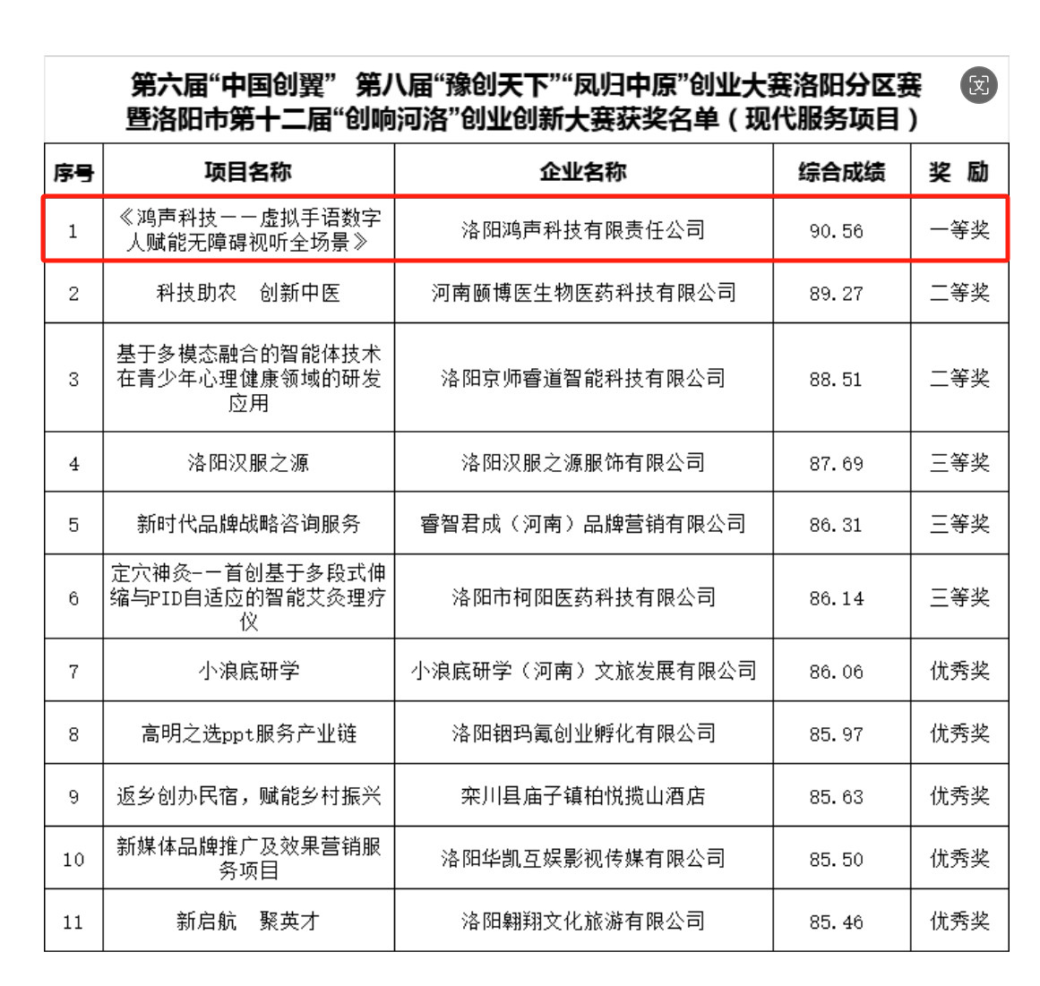 6月27日,第六届“中国创翼”、第八届“豫创天下”“凤归中原”创业大赛洛阳分区赛暨洛阳市第十二届“创响河洛”创业创新大赛决赛结果揭晓。我院《鸿声科技——虚拟手语数字人赋能无障碍视听全场景》大学生创业项目在决赛中荣获现代服务赛道一等奖。