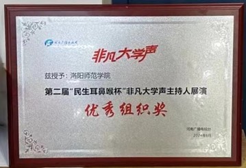 近日,我院张晓童、王佳蕾、石鑫、张馨方、杨鑫和娄心怡六名同学在第二届“非凡大学声”2024年河南省高校主持人大赛总决赛荣获优秀奖;石鑫获最具潜力奖、杨鑫获最佳台风奖、娄心怡获最具商业价值奖;蔡志豪在半决赛获最佳作品奖;陈冠霖、石琳琳和王子芃获优秀指导教师奖;我校获优秀组织奖。该赛事由河南广播电视台都市事业部主办,省内二十二所高校联合打造。