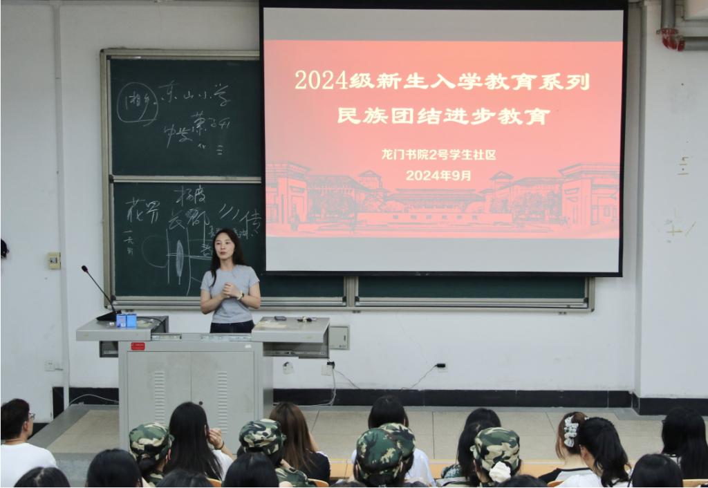 为了引导学生树立正确的国家观、民族观,进一步铸牢中华民族共同体意识,促进校园和谐发展。9月12日晚,龙门书院2号学生社区在A9—115举办“民族团结进步教育”主题活动,本次活动由龙门书院2号学生社区育人导师李佳敏主讲,全体2024级新生参与活动。