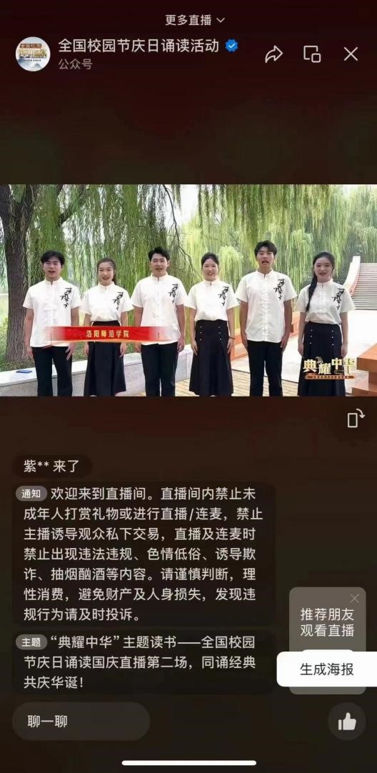 由教育部语言文字应用管理司指导,中国教育电视台主办,各地教育(语言文字工作)部门支持,国家语言文字推广基地高校协办的“典耀中华”全国校园节庆日诵读国庆直播活动于9月29日启动。应中国教育电视台邀请,在教师姚智清、石琳琳、兰皓博的指导下,我院大学生朗诵艺术团程啟源、张黎硕、邓涵宇等6位成员代表洛阳师范学院国家语言文字推广基地参与《美丽中国》合诵作品的录制,共同庆祝中华人民共和国成立75周年。