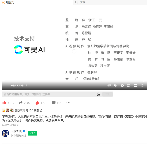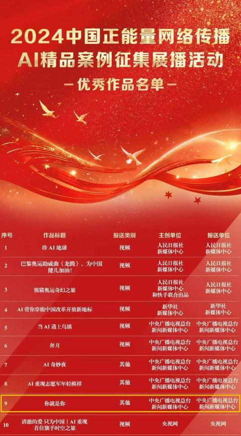 2025年3月10日,中央网信办在“中国网信网”发布《关于公示2024中国正能量网络传播AI精品案例的公告》,对拟入选对象进行公示,公示时间为3月10日至3月15日。洛阳师范学院新闻与传播学院影像行动力创意工坊AIGC团队与可灵、中央广播电视总台新闻新媒体中心联合制作的MV《你就是你》入选。