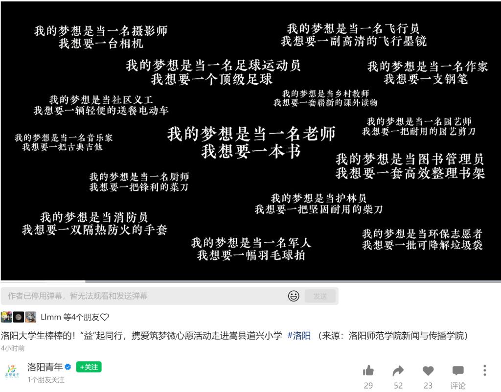 编者按:近日,大河报、大象新闻、洛阳青年视频号、顶端新闻报道洛阳师范学院:“‘益’起同行”点亮山区儿童“微心愿”