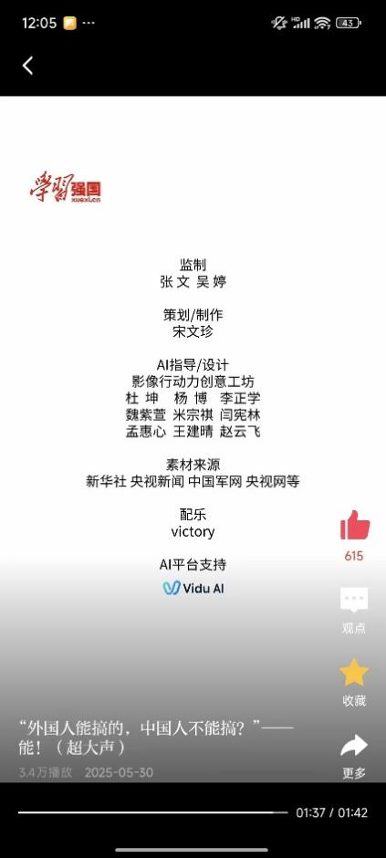 师生团队借助AI数字人技术,生动再现了钱学森、袁隆平、邓稼先、顾方舟、黄旭华、南仁东等著名科学家的影像。创作过程中,团队面临历史影像资料清晰度低、人物神态还原难度大等挑战。为最大程度还原科学家们的真实风采,师生们查阅海量历史资料,结合人物生平影像资料,对照片进行智能修复与视觉优化;基于Vidu视频大模型完成4K AI视频素材制作。该短视频发布后,登上学习强国平台推荐首页,获得了媒体和广大受众的高度评价。