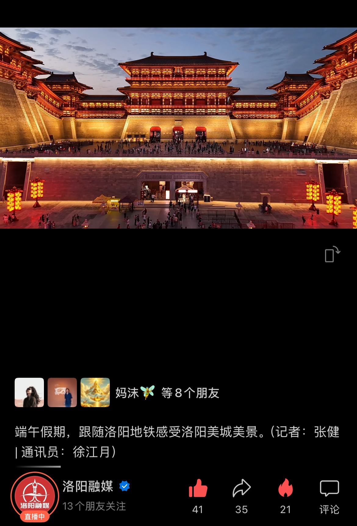6月23日,由2023级广播电视编导专业徐江月同学创作的航拍短视频在洛阳轨道交通平台播出,该作品以洛阳各个地铁站点为拍摄对象,凭借独特的视角、精湛的拍摄技艺,展现了洛阳地铁的风采面貌。作品先后被洛阳融媒和洛阳轨道交通官方平台推送,引发了广泛关注,是我院学子课程育人实践成果的又一体现。