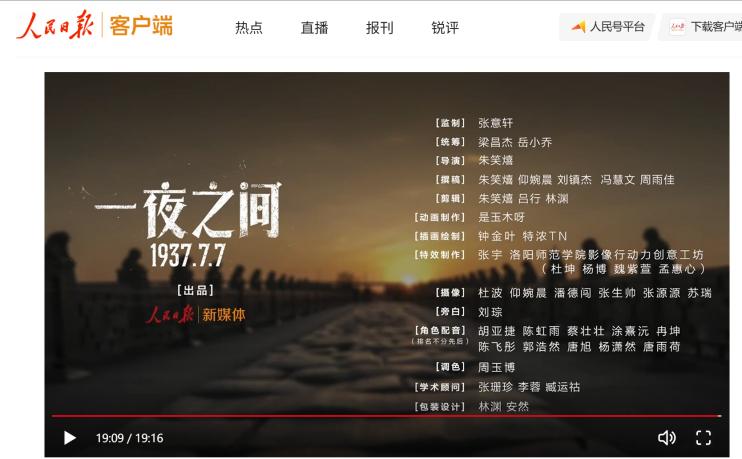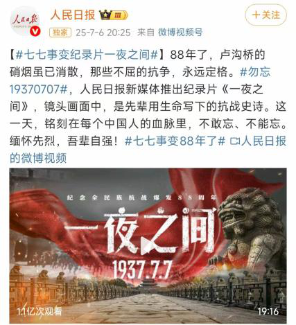 2025年7月6日,为纪念全民族抗战爆发88周年,人民日报官方微博推出重磅纪录片《一夜之间》,讲述亲历者所经历的“七七事变”。该纪录片通过人民日报新媒体全平台(微博、微信公众号、客户端等)全网首播,以深刻的历史叙事与创新的视觉表达,引发全社会对历史记忆的广泛共鸣。截至发稿,该片在微博平台播放量超1.1亿。