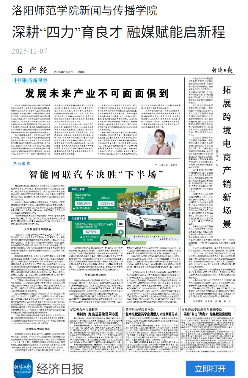 近日,我院李正学、李姗姗两位教师合作撰写的《洛阳师范学院新闻与传播学院:深耕 “四力” 育良才 融媒赋能启新程》一文在《经济日报》刊发,这是河南省高等教育教学改革研究与实践项目:“围绕‘四力’打造‘四链’:新闻舆论领域人才需求协同对接机制研究”(项目编号:2024SJGLX1099)的阶段性成果。