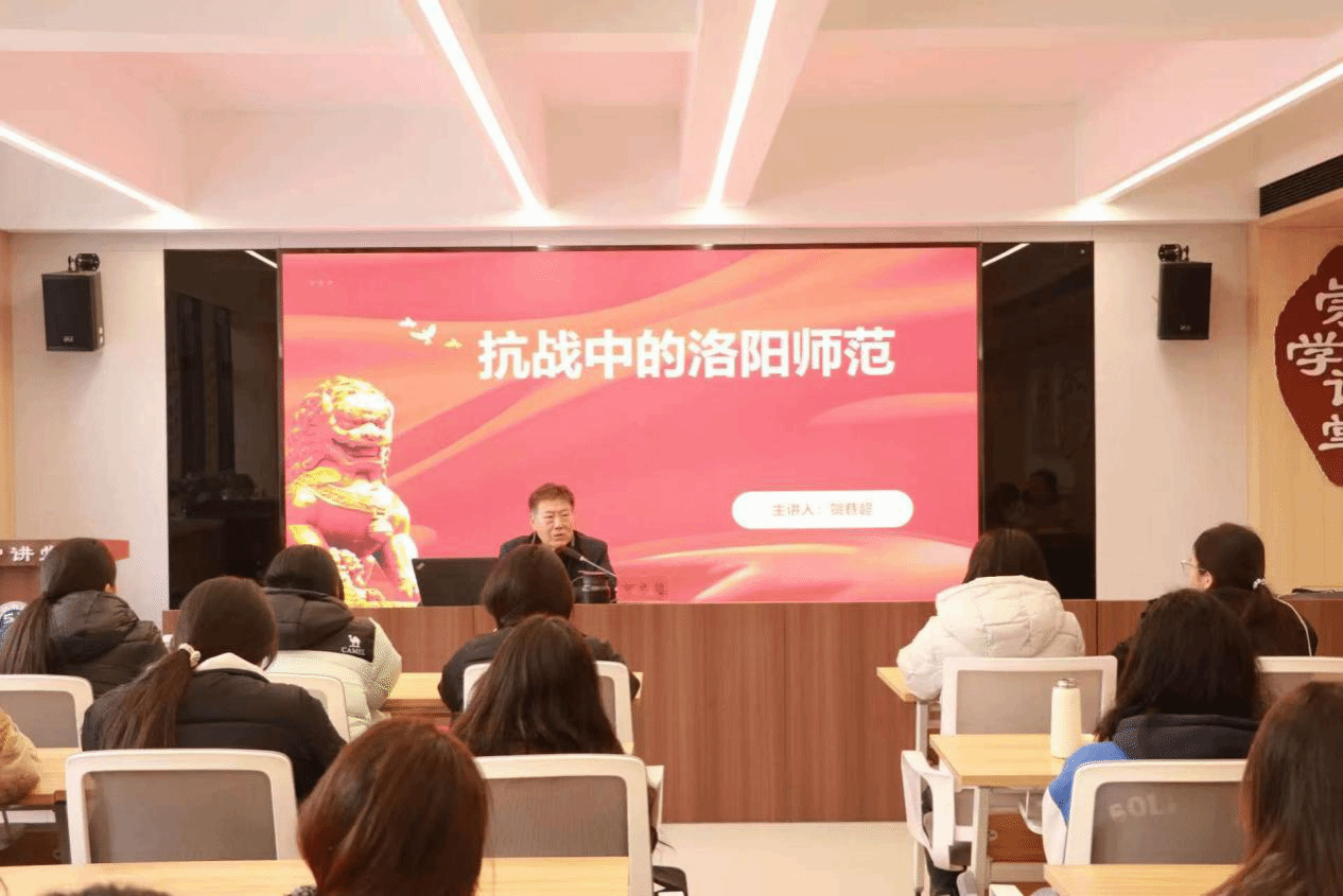 讲座中,贺巷超老师以“抗战中的洛师”为主线,从1916年学校创立的初心出发,重点讲述了抗战时期洛师人的坚守与担当。他系统梳理了全面抗战爆发后,学校在战火中坚持办学的艰辛历程——师生们在极其艰苦的环境中,一边求知求学,一边以笔为枪,通过创办报纸、排演话剧等多种形式宣传抗日思想,更有众多学子毅然投笔从戎,奔赴抗战前线。贺老师还通过“豫西学生联合会”的校史片段,生动再现了当时省立四师(洛师前身)师生以实际行动,点燃豫西大地的爱国火焰,使“厚德博学”的校训在烽火岁月中淬炼出深沉的家国情怀。此外,他还深情讲述了杰出校友、豫西早期革命先驱李翔梧的事迹,展现了洛师师生在民族危难之际的赤子之心与责任担当。