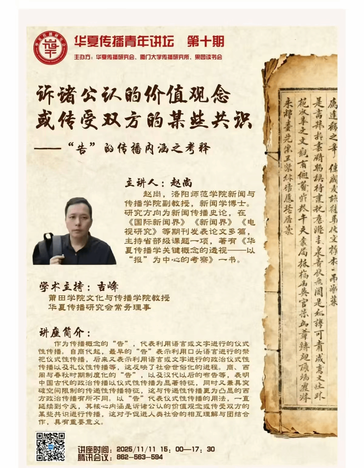 11月11日下午,应华夏传播研究会和厦门大学传播研究所的邀请,我院教师赵尚博士担任“华夏传播青年论坛”第十期的主讲嘉宾,在线上举办了一场题为《“告”的传播内涵之考释》的学术讲座。