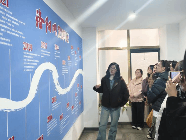 洛阳日报报业集团采编管理部副主任马超峰、王玲聪组织师生们分别参观了“洛阳网”各运营部、“中央厨房”大厅、视觉梦工坊、洛阳国际传播中心等区域,向同学们系统阐释了各部门的运行机制与创新成果,通过现场观摩与宣传片展映,同学们全景式了解了现代媒体的内容生产流程与传播策略。其中,2025年新成立的洛阳国际传播中心,通过多元化海外传播渠道、跨文化内容共创等创新实践,向国际社会展现洛阳城市魅力与文化底蕴的探索,给同学们留下了深刻印象。