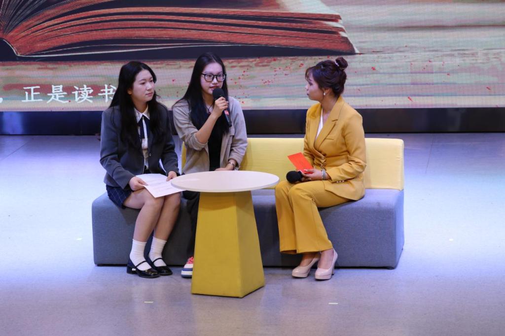 分享会开始,参与人员共同观看了两段视频,通过名人名家的故事分享告诉大家读书的意义以及如何养成读书的习惯。观看结束,吴艺烜、刘玉琪两位读书爱好者上台从阅读习惯、个人体会等方面分享了《心安即是归处》和《心学的智慧》两本书记,畅谈读书成果和阅读心得。主持人康莹针对印象最深的一句话以及个人读书小妙招等进行提问,为分享会增添了趣味性和互动性。分享活动结束后,播音系的蔡志豪同学将自己最常读的诗词《赤壁赋》通过朗诵的形式同大家一起分享。
