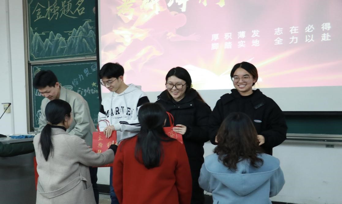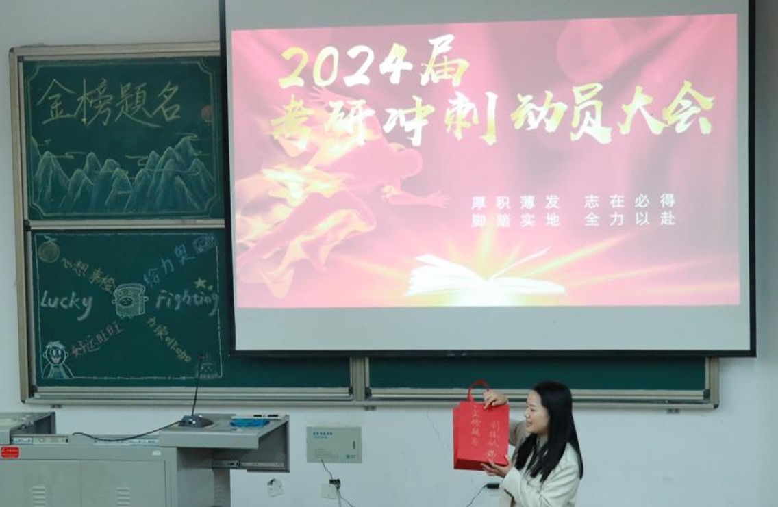 钱越、李姗姗、于正凯、金宜洛分别作了动员讲话。他们从考试心态、复习效率、考试技巧三个方面进行了总结。他们强调,同学们要调整好心态,乐观积极;要明确考研目标和方向,理性分析个人情况,补齐短板,合理做好考研复习计划;要合理分配时间与精力,调整复习进度,劳逸结合,提高备考质量。他们为同学们详细分析了学院近年的升学情况及就业形势,并结合学院学科优势、专业特点和人才培养等鼓励同学们在考研之路上敢于有梦、勇于追梦、勤于圆梦。并为考研学生发放加油礼包。