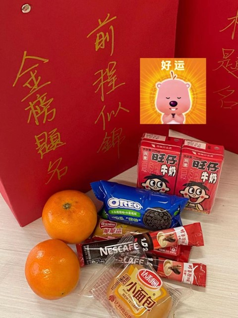 动员会伊始,20级辅导员魏蕊蕊为我院考研学生展示考研“加油大礼包”,并介绍其中寓意。红色手提袋上是我院大一大二大三的同学自发为学长学姐写上的祝福语“金榜题名,前程似锦”,表达心中美好祝愿;手提袋内准备了旺仔牛奶——“旺旺”到底、橙子——心想事“橙”、面包——考试“包”过、奥利奥——加油,奥利给、巧克力脆脆鲨——“巧克”难题以及咖啡——蓄力满满,祝愿大家好运连连,成功上岸。
