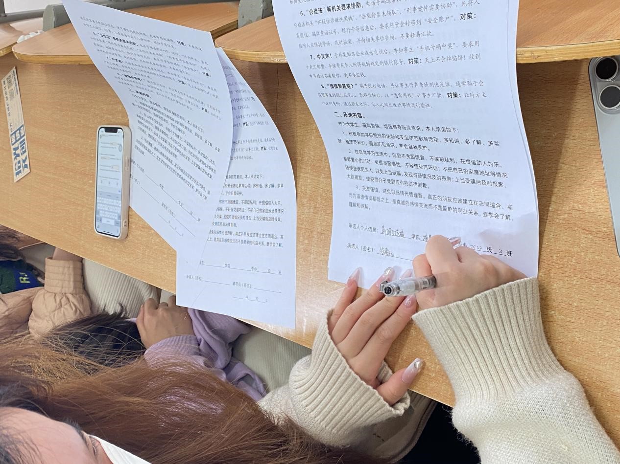 活动期间,学院召开教职工防范电信网络诈骗专题会议,各年级辅导员深入学生课堂和宿舍,以防诈骗知识微视频制作、专题班会和现场“以案说法”、签署抄写防范网络电信诈骗承诺书等多种方式,针对电信网络诈骗问题,向学生普及了常见的电信网络诈骗手段,如假冒公检法机关、冒充亲友求助等,同时分享了防范诈骗的经验和技巧。此外,活动还设置了互动环节,让学生进行面对面地谈论交流和提问,共同探讨解决方案。