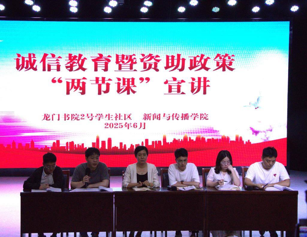 为进一步加强学生对资助政策的了解,提升资助工作精准度与服务水平,6月12日,我院联合龙门书院二号院于学院演播厅开展诚信教育暨资助政策“两节课”宣讲活动,新闻与传播学院党委副书记、龙门书院2号学生社区党委副书记金宜洛,2023级、2024级全体育人导师、各班级主要学生干部参与本次活动。