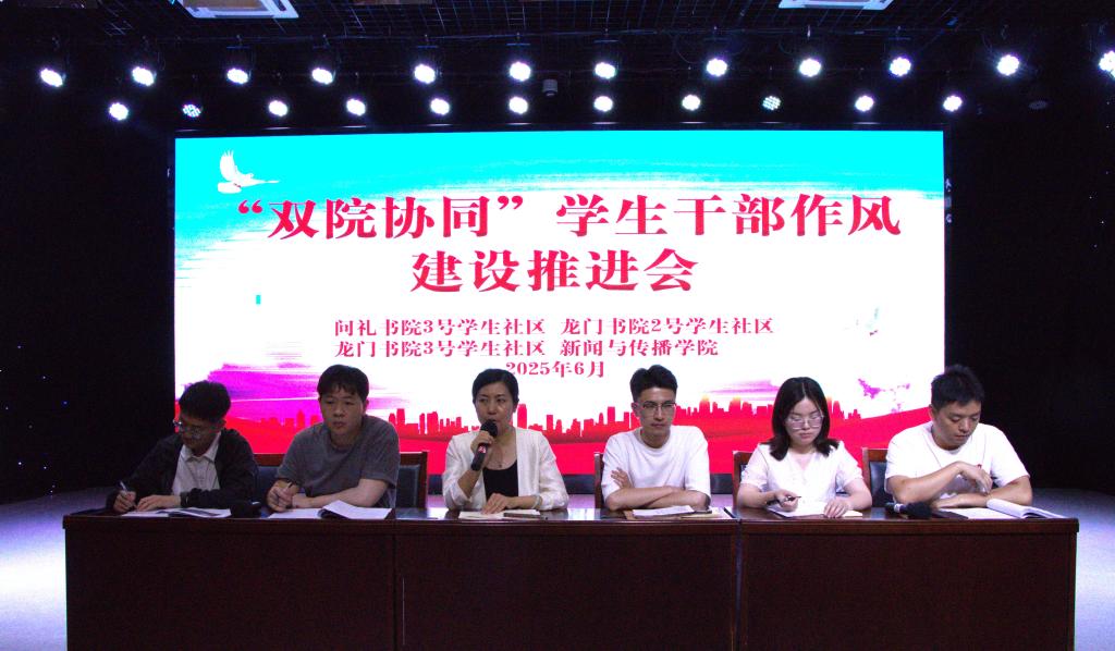 为进一步加强学生干部队伍建设,提升服务意识与工作效能,6月12日中午,我院在演播厅组织召开“双院协同”学生干部作风建设推进会。新闻与传播学院党委副书记、龙门书院2号学生社区党委副书记金宜洛出席会议,各相关书院育人导师、各班级主要学生干部参与。