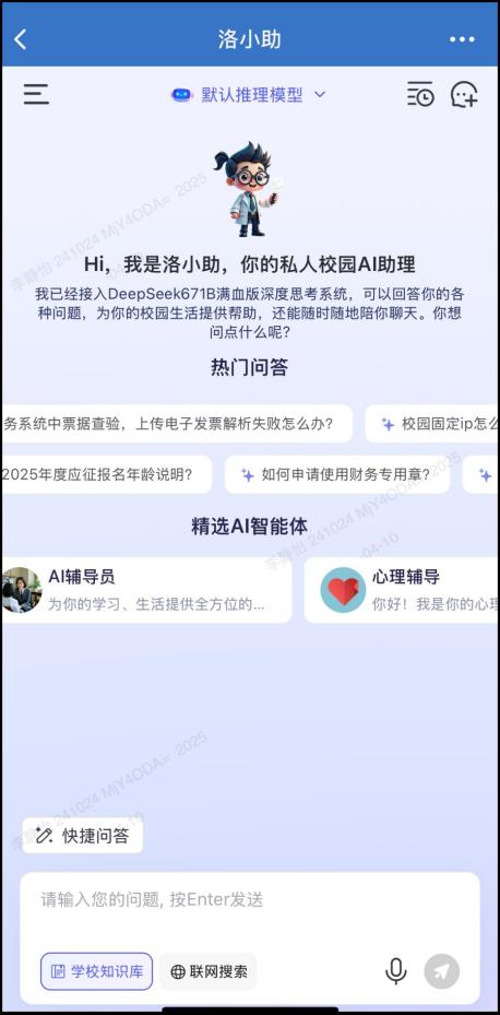 为深化智慧校园建设,提升师生事务办理效率,我校精心打造的“洛小助”AI助手于4月11日起正式上线试运行。“洛小助”AI助手依托DeepSeek大模型的先进算法,利用大语言模型技术,基于学校门户和各单位网站信息为师生提供学校规章制度、教育教学、团学工作、管理服务、工作动态等内容相关的问答服务。师生可以通过以下方式使用“洛小助”: