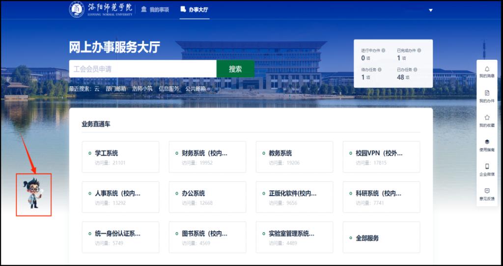 2.Web端使用。校内师生在校园网主页选择登录“一网通办”,点击左侧“洛小助”人物形象,即可开启智能对话。