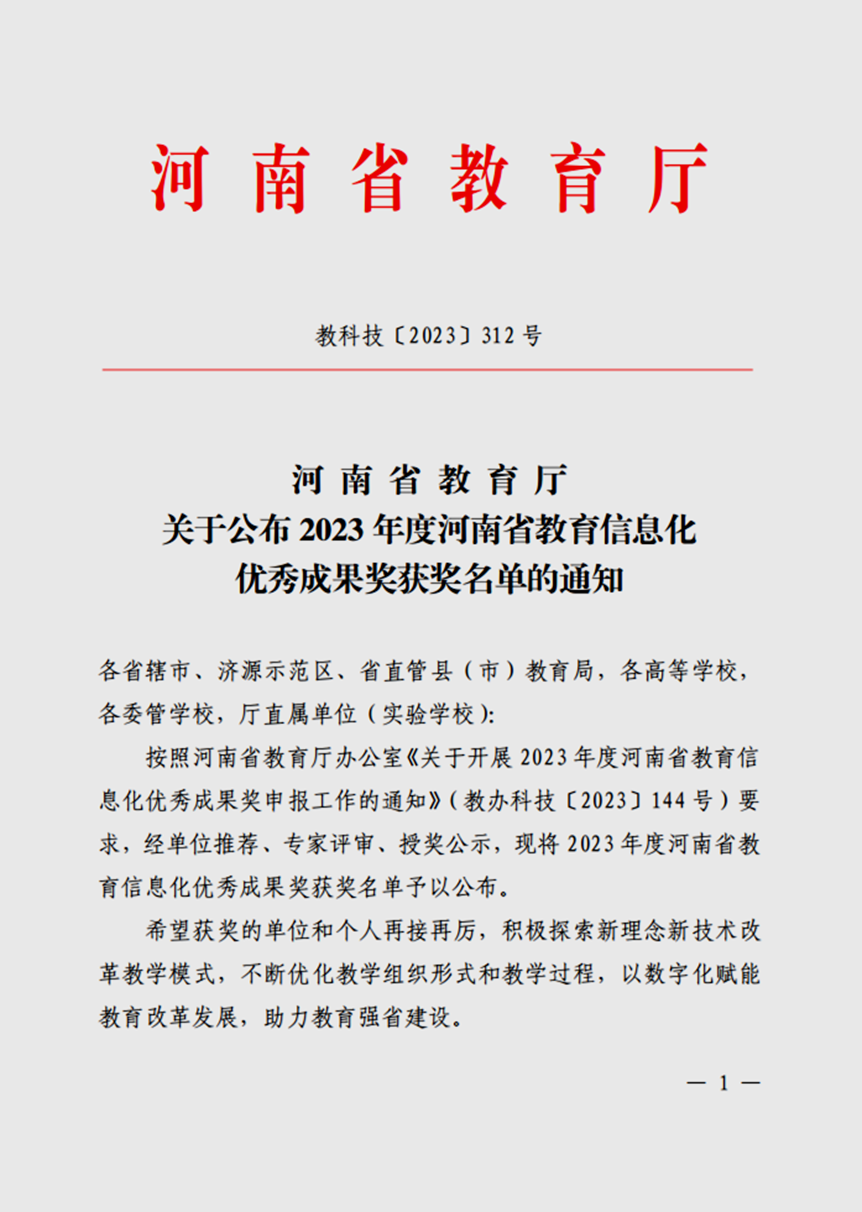 近日,河南省教育厅下发《关于公布2023年度河南省教育信息化优秀成果奖获奖名单的通知》(教科技〔2023〕312号),公布了2023年河南省教育信息化优秀成果获奖名单,我校共获奖6项,其中理论研究类一等奖1项,二等奖3项,创新应用类二等奖2项。