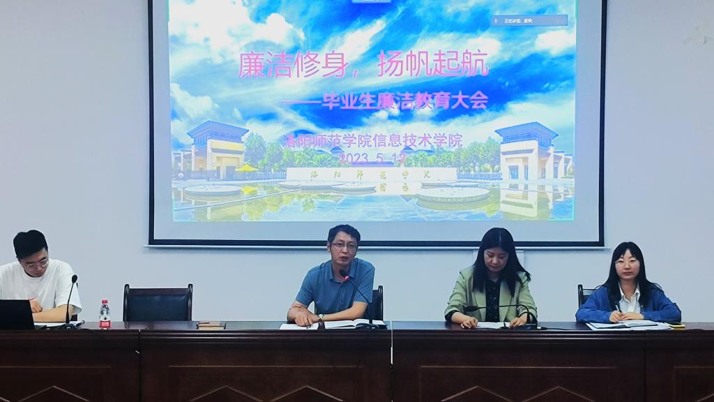 为培养学生的廉洁意识,帮助学生明德修身,5月12日下午六点,我院于信息楼一楼报告厅开展“廉洁修身,扬帆起航”毕业生廉洁教育主题会议,我院党委书记曹凡、党委副书记董欢欢、2023届毕业生辅导员刘家豪、孟宇、2023届毕业生代表参加会议。