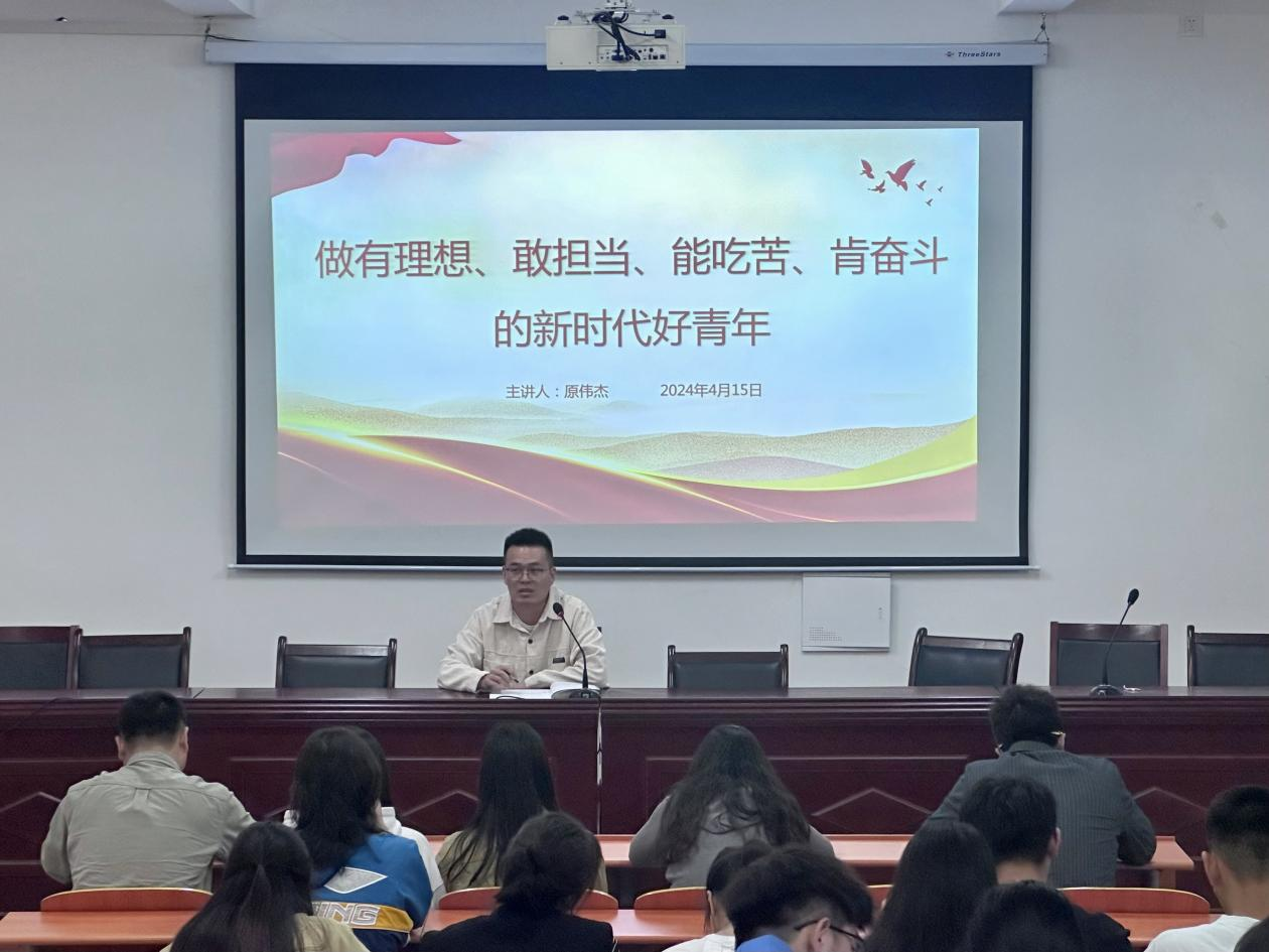 4月15日中午12时,我院在信息楼一楼报告厅开展以“做有理想、敢担当、能吃苦、肯奋斗的新时代好青年”为主题的团学干部培训会,23级辅导员原伟杰主讲,全体辅导员及团学干部参加。