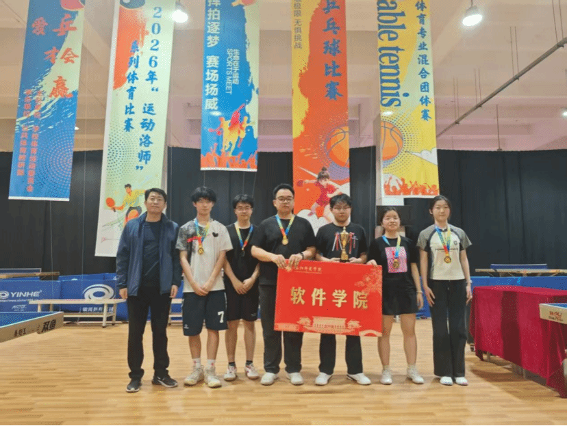 银球飞舞传激情,球拍挥舞展雄风。2026年4月20日,2026年“运动洛师”乒乓球比赛在学校体育馆圆满落幕,软件学院学子最终拿下2026年“运动洛师”乒乓球比赛全校冠军!