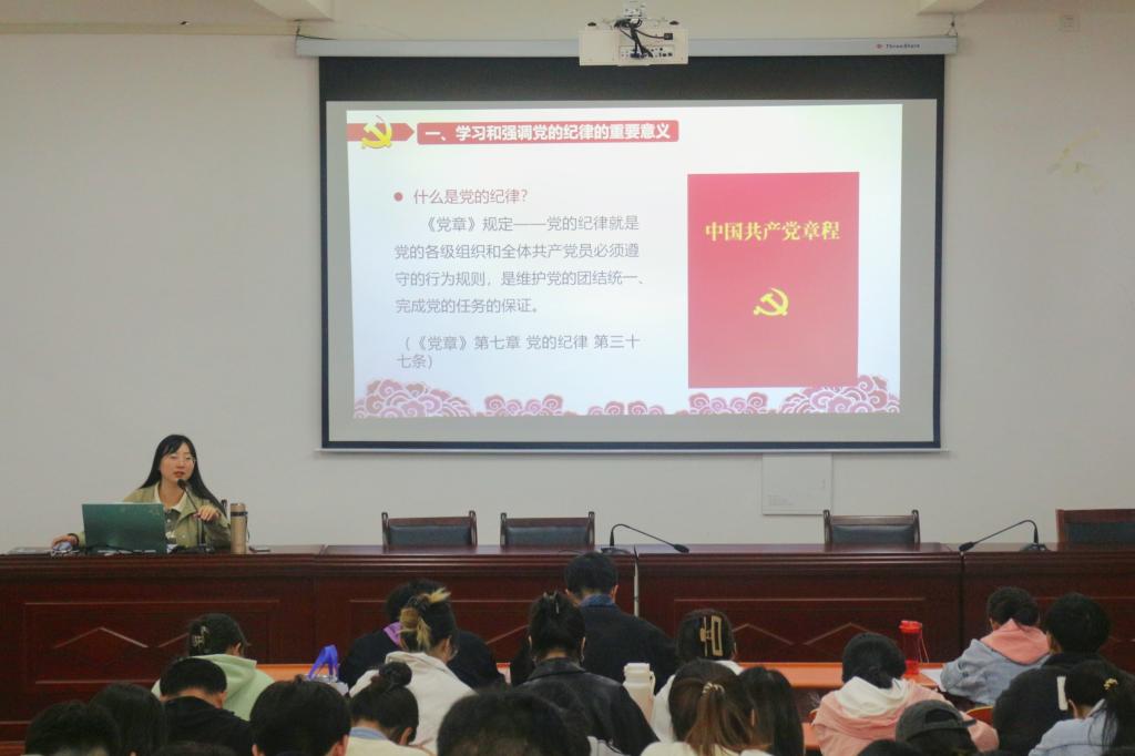 10月30日晚18时30分,我院22级辅导员张倩倩于信息楼一楼报告厅开展严守党的纪律、发扬优良作风的党课专题活动,23下新确定入党积极分子、23上预备党员、青马班成员认真聆听。