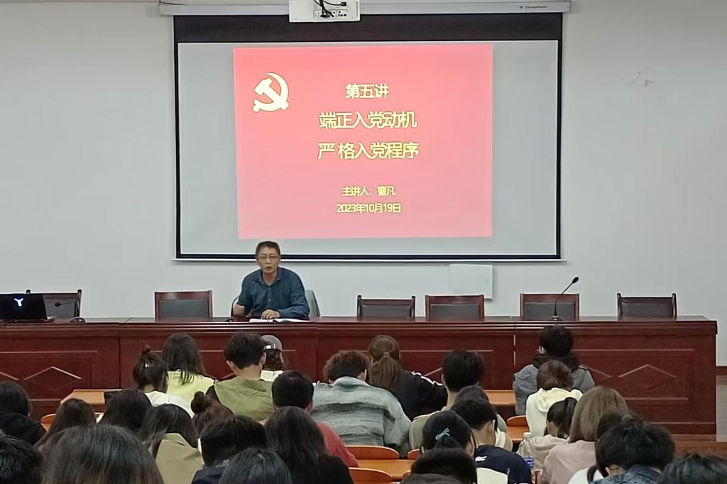 本次党课,曹凡以动机一词为切入点,讲述了什么是入党动机,入党动机的几种表现形式,如何端正自己的入党动机。他指出,我们要向老一辈无产阶级革命家学习,要向新中国无数个舍小家顾大家的奋斗者学习,从伟大建党精神开始,不同历史时期的党员肩负者不同的责任与使命,他们创造了中国共产党精神谱系,他们用行动践行了什么才是正确的入党动机。他表示,作为一名积极分子,我们要赓续红色血脉、端正入党动机,用实际行动再续辉煌,只有从思想深处认同全心全意为人民服务才是唯一正确的入党动机。他强调,回顾党的百年奋斗历程,积极分子要从中不断汲取精神养分,不断增强政治素养、理论素养、专业素养,持续提升家国情怀和思想认识,从内心认同党、热爱党、忠于党,做到学思想、强党性、重实践、建新功。最后,曹凡聚焦入党程序,详细讲解从申请入党到成为正式党员的五个步骤,明确要求积极分子要主动与培养人定期汇报思想,在培养人的培养下,坚持在思想上、行动上与党中央保持一致。