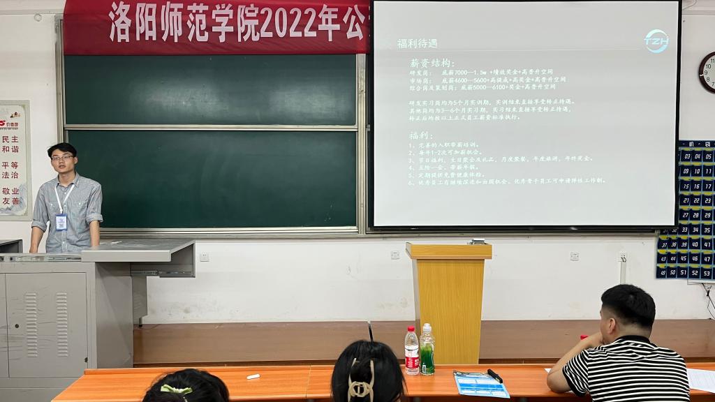 刘家豪首先带领大家熟悉本次招聘会的流程,对参加会议的用人单位进行简单介绍。接着,河南蓝鸥科技有限公司、河南扬文信息科技有限公司、郑州匠云网络科技有限公司、河南源福达信息科技有限公司、河南天之恒信息科技有限公司、叶县旧县高级中学依次介绍各自单位的工作方向、应聘条件、薪资待遇、工作补贴、公司环境、住宿条件和节假日安排等。最后,参加招聘会的毕业生对自己感兴趣的企业或高校进行了一对一的详细询问和深入了解,选择最合适自己的职业道路,毕业生们反响热烈,积极投递简历。