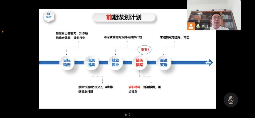 本次讲座以“选择是人生的常态”为出发点,围绕大学生就业、择业现实化这个方面展开,陈江提出前期要谋划、计划,他建议同学们从确定目标、收集信息、就业择业、简历撰写、面试双选五个方面开始规划。同时向大家提出对就业的态度应先就业,再择业;对工作的态度应脚踏实地,先干出成绩,再争取待遇;对人生的态度应诚实面对,严于律己,宽以待人。他结合自身感悟向大家分享三句话:先就业,再择业的谋划长远,做到心中有数,远中近、高中低搭配。要谋划长远,做到心中有数,远中近、高中低搭配。最后,他强调大学生就业重点在准备,计划关键在落实,难点在遇到困难之后的坚持。同学们积极提问,气氛热烈。