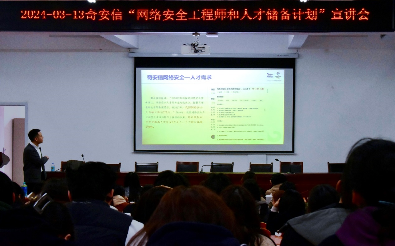 3月13日下午2时,奇安信科技集团于我院信息楼一楼报告厅举办“网络安全工程师和人才储备计划”主题宣讲会,奇安信&联芸网络安全产业服务中心副总经理兼校业务总经理班雨主讲,我院20级毕业生参加。