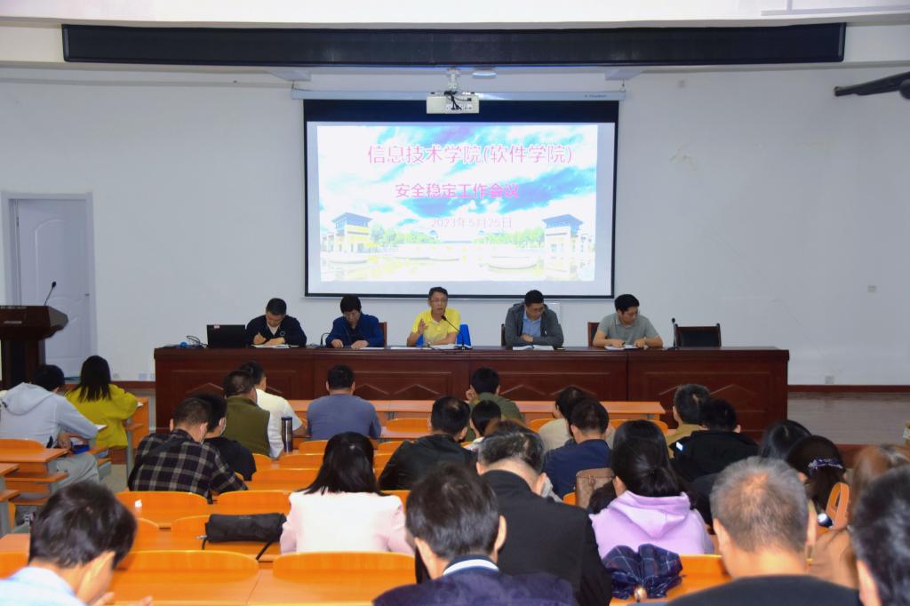 5月25日下午14点30分,我院在信息楼一楼报告厅召开安全稳定工作会议,会议由我院党委书记曹凡主持,全体教职工参加。