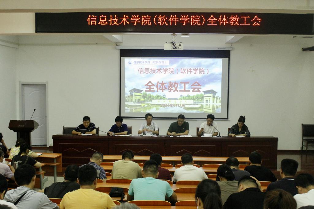 9月2日下午14时30分, 我院在信息楼一楼报告厅召开全体教职工大会。我院党委书记曹凡,院长张永新,副院长李元臣、贾世杰、李德光,副书记董欢欢出席本次会议,全体教职工积极参加。