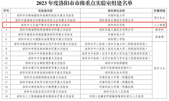 近日,洛阳市科技局公布了2023年度洛阳市新建重点实验室名单(洛市科[2023]70号),我院院长张永新教授牵头申报的“洛阳市文化遗产数字化保护重点实验室”成功入选。这是我院近年来不断加强基础理论研究与应用技术研发,积极融入国家和省市科技创新体系的结果。
