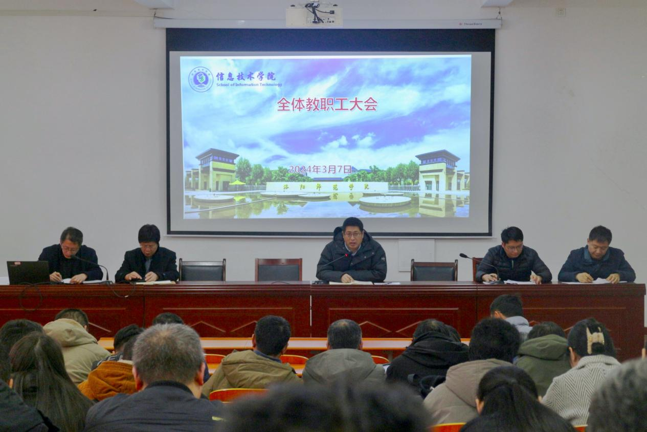 3月7日14时30分,我院于信息楼一楼报告厅举行全体教职工大会。本次会议由院长张永新主持,我院党委书记曹凡、副院长李元臣、贾世杰、李德光出席,全体教职工参加会议。