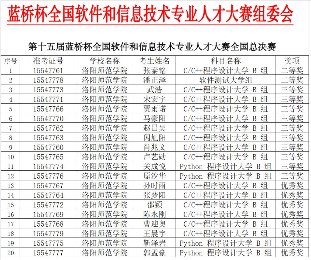 近日,第十五届蓝桥杯全国软件和信息技术专业人才大赛全国总决赛成绩揭晓。我院共20名学生在C/C++程序设计、Python程序设计、软件测试三大竞赛科目中获得佳绩,共获得国家级二等奖2项,国家级三等奖10项,国家级优胜奖8项。