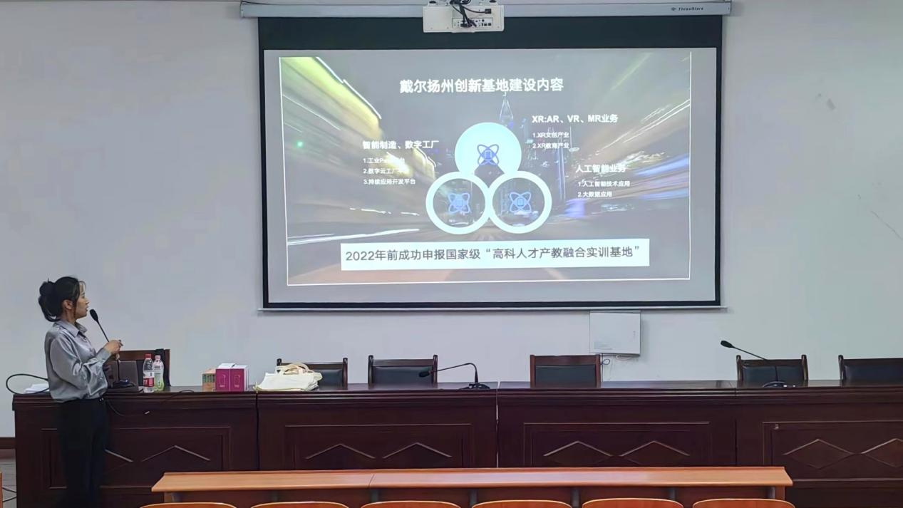 6月6日下午,戴尔·扬州创新基地⼈才实训项目负责人宋佩帆详细介绍了该基地的项目内容、软件园配套设施和合作单位等方面的情况。她谈到,戴尔·扬州创新基地不仅是一个集结了众多先进科技与创新理念的高端平台,更是培育新时代人才、推动地方经济发展的重要引擎。同时,她鼓励学生积极参加实训活动,不断提高自己的专业技能和综合素质,为未来高质量就业做好扎实准备。
