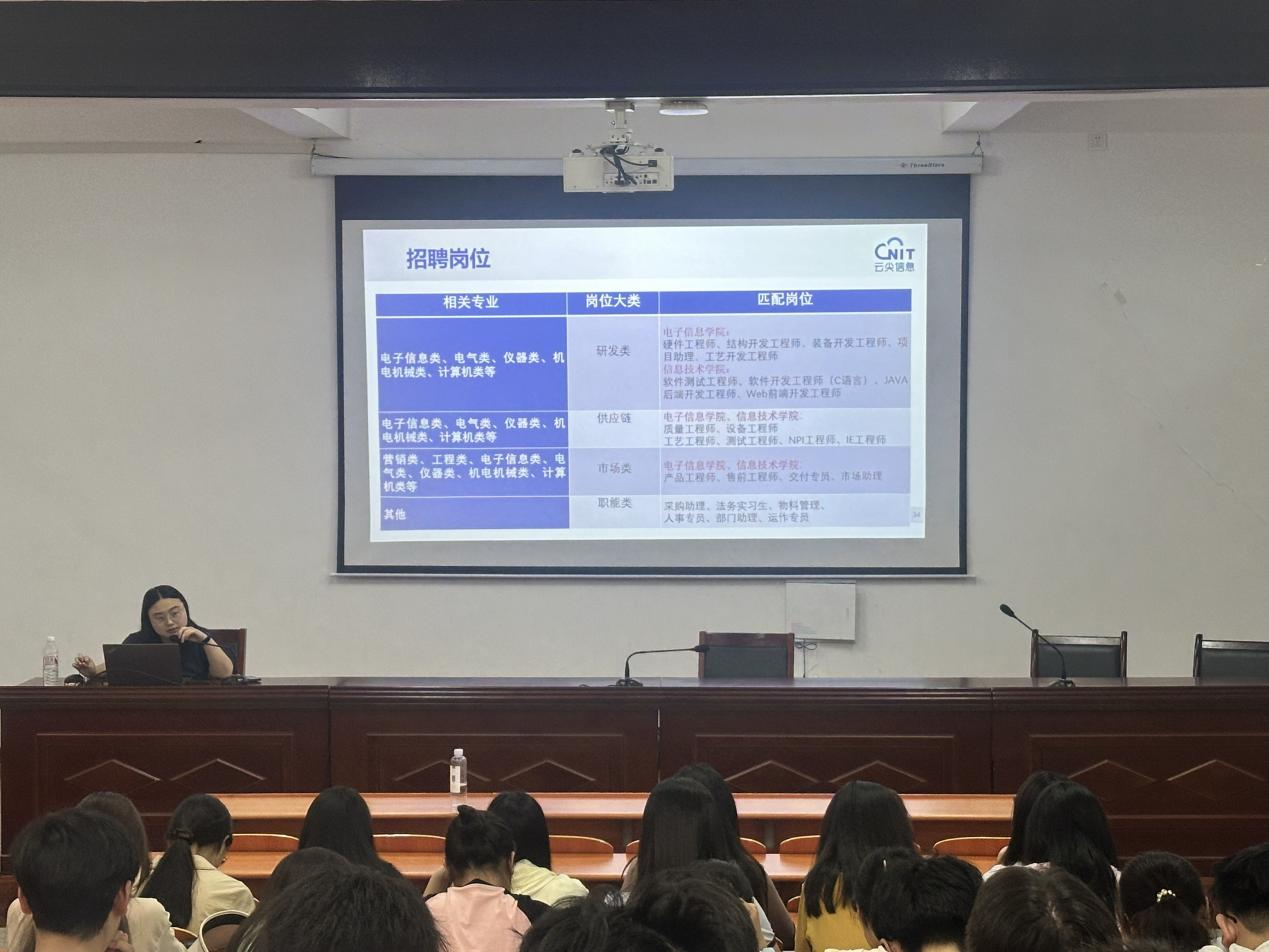 5月30日下午,云尖信息技术有限公司负责人李蒙婷和徐小雁分别就公司的成立背景、投资成本、核心团队、企业文化、实习实训岗位需求及福利待遇进行了详细介绍。李蒙婷表示,云尖信息技术有限公司非常重视员工培训和成长规划,并一对一地为员工向上发展提供支持。徐小雁重点分享了自己的职业成长经历,并为学生们提供了宝贵的求职经验和建议。