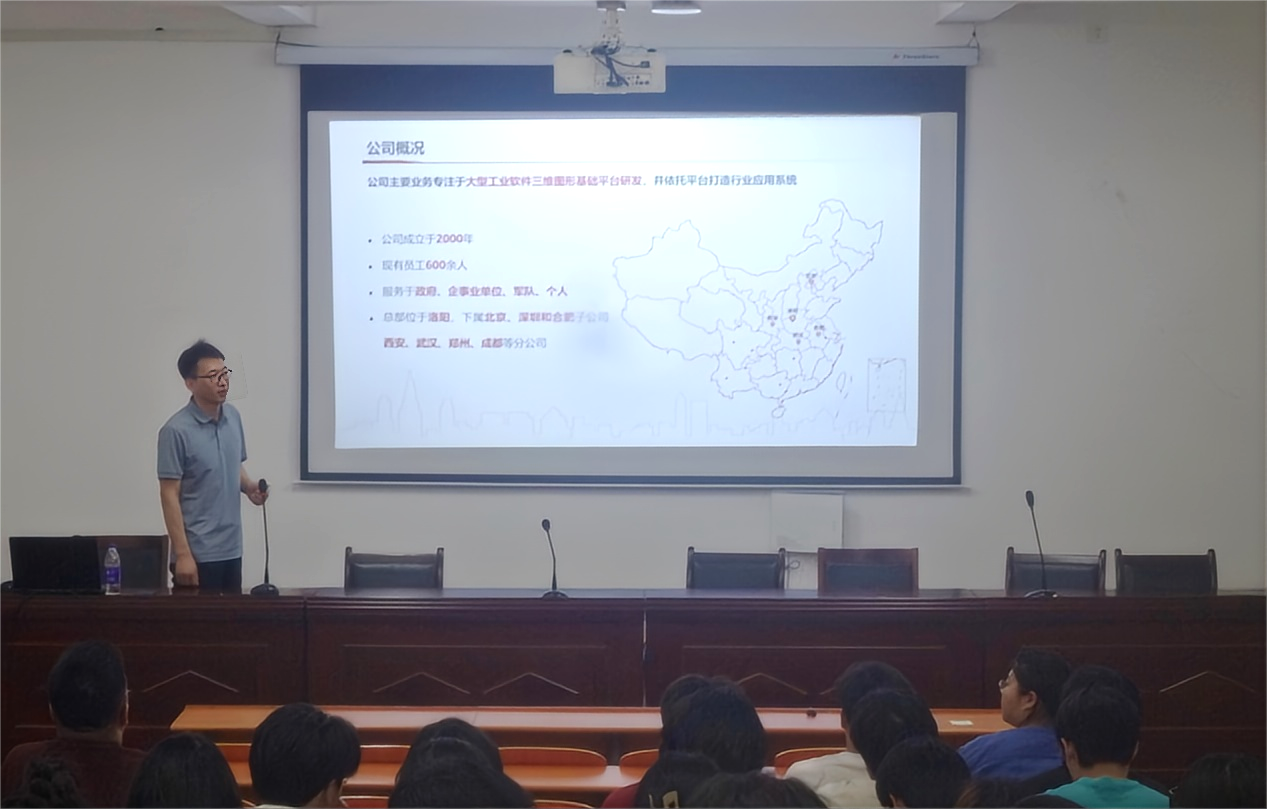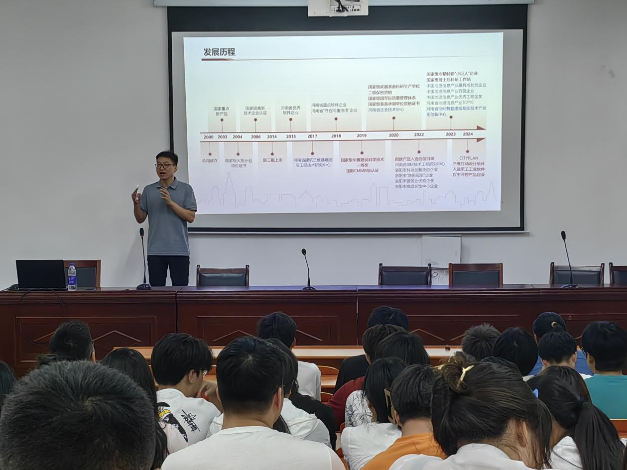 6月12日,洛阳众智软件股份有限公司副总经理陈硕分别就公司的基本概况、发展历程、产品架构体系、三维 CAD 平台 Cityplan和研发平台的应用方向向同学们进行了详细介绍。陈硕表示,洛阳众智软件股份有限公司研发的平台广泛应用于住建行业、军工领域、自然资源等领域,且公司具备正确的选择方向和良好的市场前景。在互动交流环节,陈硕热情为同学们答疑解惑。同时,他希望同学们脚踏实地、奋发有为,以便为未来顺利就业奠定基础。